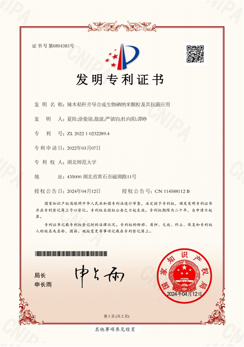 近日,特色野菜良种繁育与综合利用技术湖北工程中心的夏险博士团队的“辣木秸秆介导合成生物硒纳米颗粒及其抗菌应用”成果喜获国家发明专利(CN114588112A)。这是团队在涂俊铭教授指导下,继国家发明专利(CN114569558B)和(CN114426990B)后的又一成果。