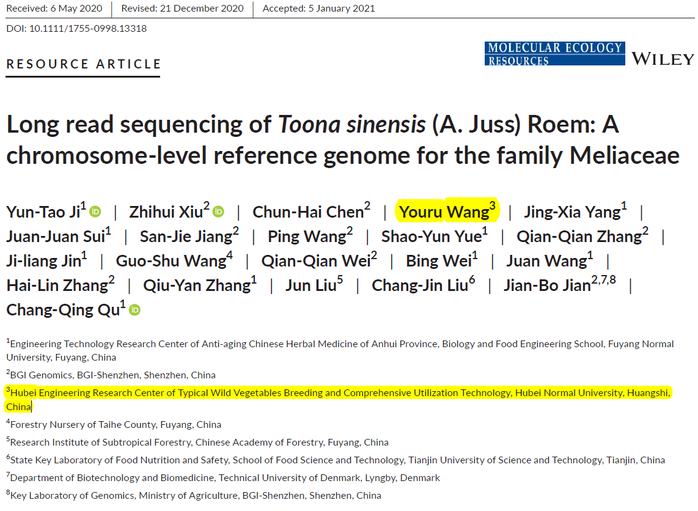 特色野菜良种繁育与综合利用技术湖北工程中心的王友如教授团队和阜阳师范大学、中国林业科学研究院亚热带林业研究所、天津科技大学、华大基因等单位组成的创新团队经过三年多的努力,圆满完成了香椿基因组的测序组装工作,标志着国际楝科植物首个染色体水平的全基因组测序组装完成,基于基因组测序的学术论文“Long read sequencing of Toona sinensis (A. Juss) Roem: A chromosome-level reference genome for the family Meliaceae”于2021年在生物学领域TOP期刊《Molecular Ecology Resources》发表,王友如教授为该论文的共同第一作者。香椿基因组测序成果为香椿品质和产量相关的分子标记辅助育种研究,推进香椿遗传改良进程奠定了良好基础。