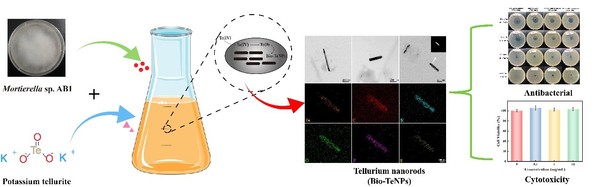 在本研究中,分离到一株高亚碲酸盐耐受性真菌Mortierella sp. AB1,利用所述菌株在对高毒性的Te(IV)还原为毒性较低的单质碲的同时,合成具有生物学功能的生物碲纳米材料(Bio-TeNPs)。分析了生物碲纳米材料的纳米特征,评估了其抗菌活性、抗氧化能力和细胞毒性。在开展新型功能性有机纳米抗菌材料的研究中,利用生物学方法合成的有机碲纳米抗菌材料,一方面可以缓解Te(IV)在环境中的高毒性,另一方面,生产的生物碲纳米颗粒具有独特的抗菌功能,对缓解环境问题有着双重意义。本研究得到国家自然科学基金(32000066)、湖北省重点研发计划(2021BCA148)、william威廉英国创新团队(T201907)及食用野生植物保育与利用湖北省重点实验室开放基金的资助。