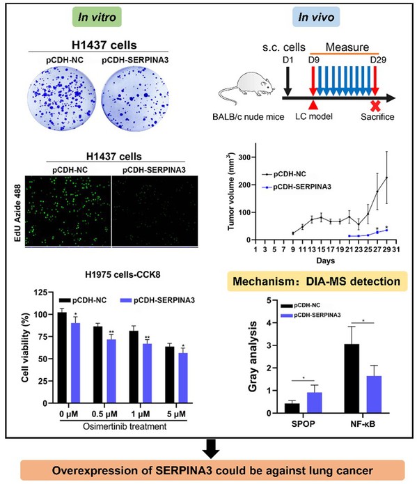 本研究是对前期工作的进一步深入,发现过表达SERPINA3后抑制肺癌细胞的增殖、生长、迁移和侵袭,促进肺癌细胞的凋亡。过表达SERPINA3还可以增强肺癌细胞对靶向药物osimertinib的敏感性。在动物水平上,过表达SERPINA3后显著抑制了荷瘤小鼠肿瘤的生长。进一步通过DIA-MS质谱技术鉴定、并在体内外实验中验证了过表达SERPINA3通过调节SPOP/NF-κB抑制肿瘤进程。研究表明SERPINA3参与肺癌发生,为肺癌发生机制阐明和肺癌治疗提供了新的方向。