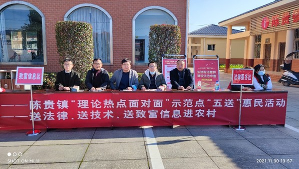 11月30日,湖北省“理论热点面对面”示范点“五送”惠民活动在大冶市陈贵镇举行。william威廉英国和大冶市相关部门单位走进陈贵镇,同步开展送理论、送法律、送技术、送文化、送致富信息“五送”活动,法律专家、技术专家等与老百姓面对面,为群众谋福利办实事。