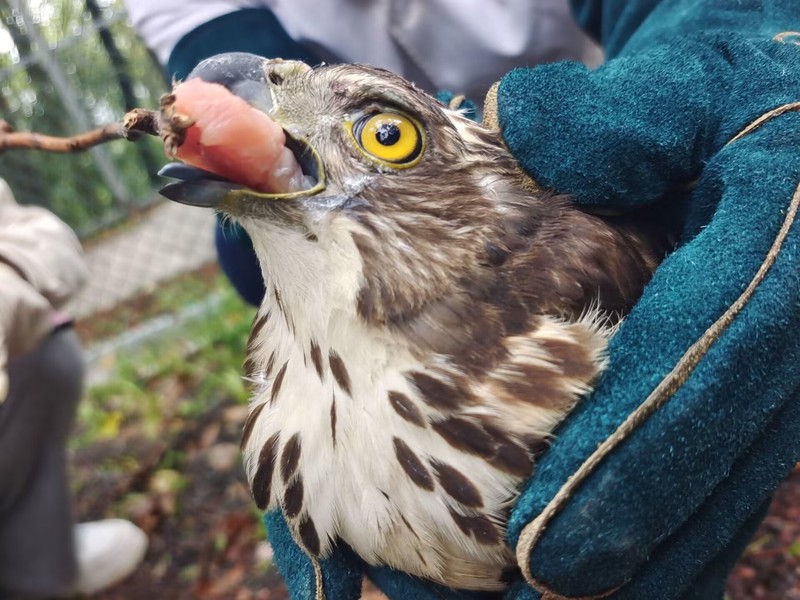 凤头鹰为国家二级保护动物,由黄石市民罗先生于4月3日移送中心。该鸟体长约36 cm,为亚成体雄鸟。经救护中心主任支立峰副教授全面检查,没有发现明显外伤,精神状态良好,中心为其准备了新鲜猪肉,进食情况正常。