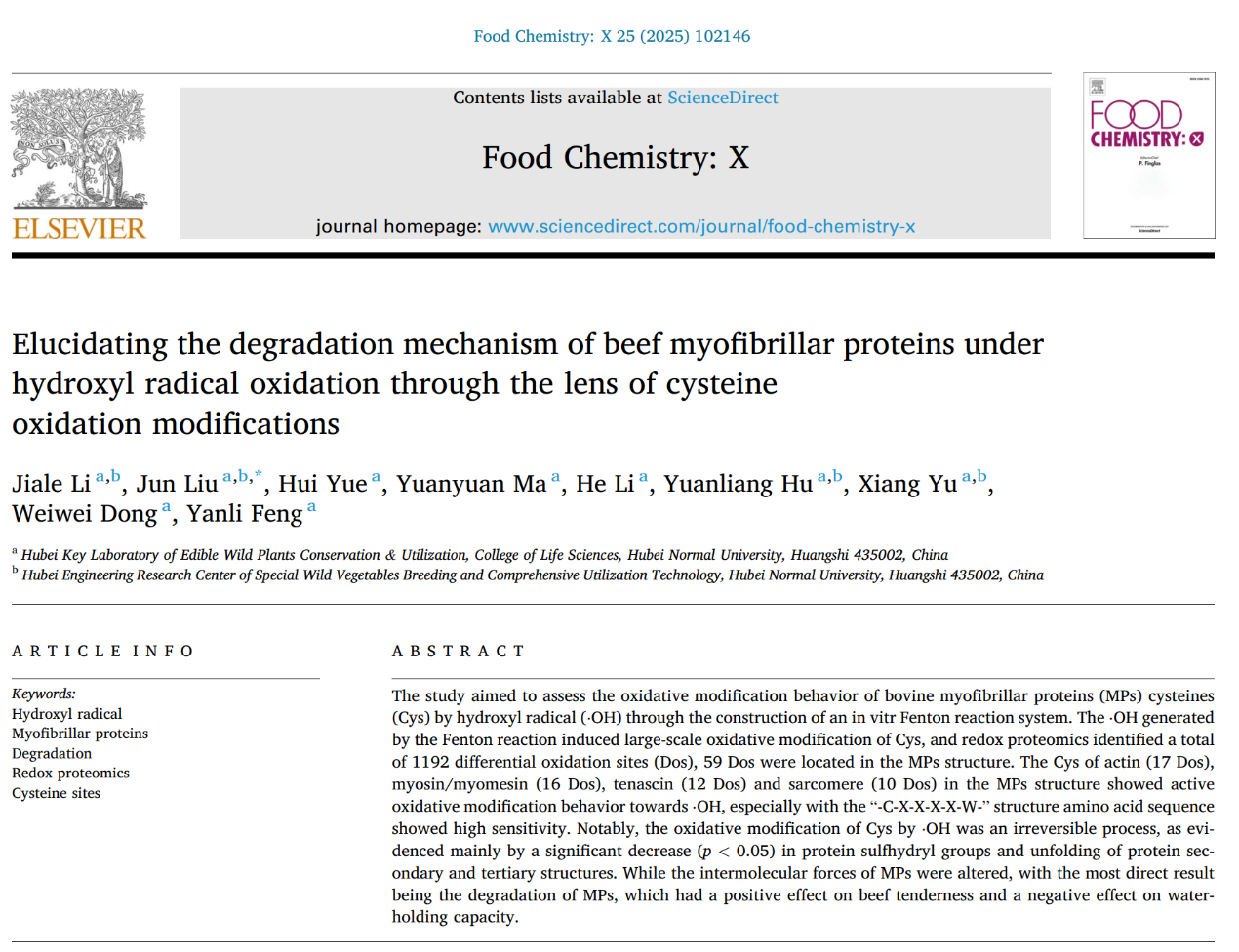 论文信息:LI J, LIU J, YUE H, et al. Elucidating the degradation mechanism of beef myofibrillar proteins under hydroxyl radical oxidation through the lens of cysteine oxidation modifications[J]. Food Chemistry: X, 2025,25: 102146.