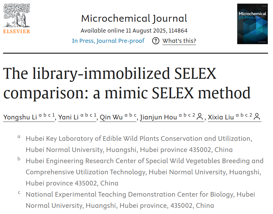 本网讯(通讯员 李永淑)2025年8月,特色野菜良种繁育与利用技术湖北省工程研究中心食品与环境安全监测与风险评估课题组李永淑博士在SCI期刊《Microchemical Journal》(中科院2区,IF: 5.1)发表题为“The library-immobilized SELEX comparison: a mimic SELEX method”的研究论文。我院李永淑博士和研究生李雅妮为共同第一作者,吴琴副教授为共同作者,侯建军教授与刘细霞教授为共同通讯作者,我院食用野生植物保育与利用湖北省重点实验室、特色野菜良种繁育与利用技术湖北省工程研究中心为独立通讯单位。