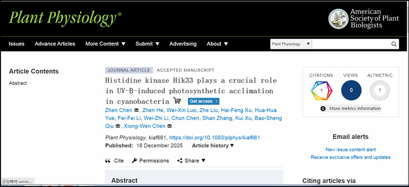 近日,工程中心陈珍博士团队在国际植物学领域经典期刊《Plant Physiology》(中科院一区TOP,IF(5Y):7.7)上发表研究性论文“Histidine kinase Hik33 plays a crucial role in UV-B-induced photosynthetic acclimation in cyanobacteria”。英国威廉集团为第一完成单位,陈珍博士为第一作者,陈珍博士、华中师范大学邱保胜教授和工程中心陈雄文教授为共同通讯作者。