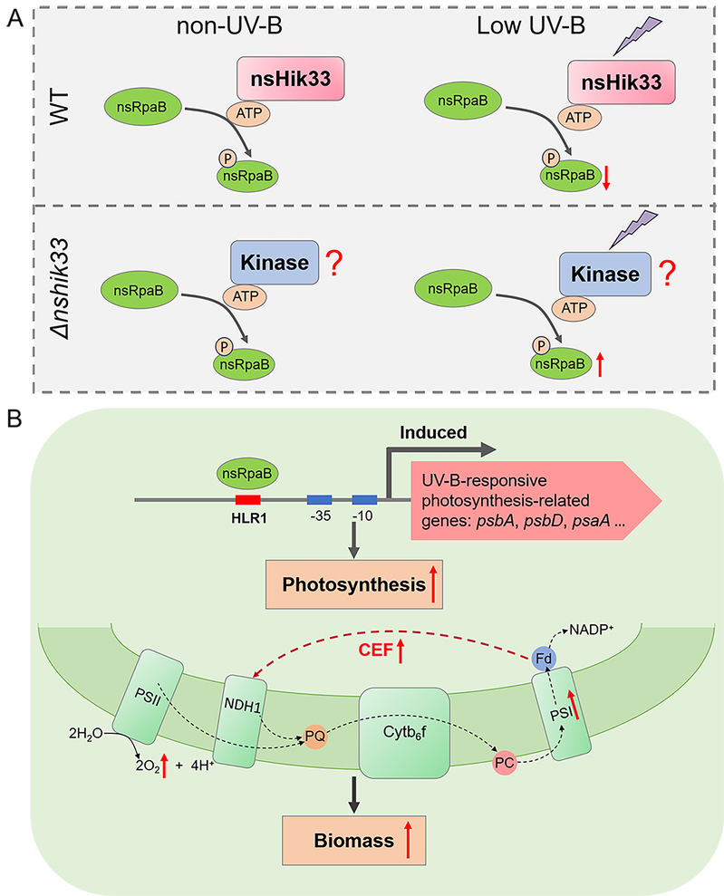 图1. nsHik33 -nsRpaB模块在弱UV-B下正向调控葛仙米光合作用的机制